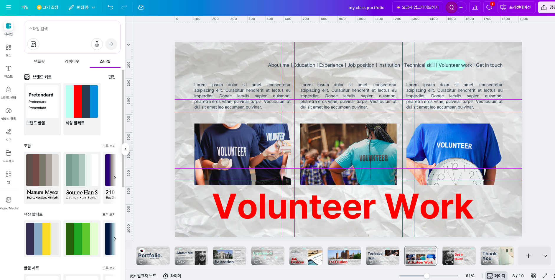 디자인 만들기 → 프레젠테이션 (1920×1080)을 선택한다.템플릿 패널에서 포트폴리오를 검색하고 스타일 필터로 미니멀, 모던, 크리에이티브 중 하나를 선택한다. 템플릿 사용을 눌러 복제한다.디자인 → 브랜드 키트를 열고 브랜드 색상에 본인의 대표 색상 3개를 등록한다. 브랜드 폰트에서 Pretendard, Noto Sans KR, Roboto 중 하나를 선택한다.파일 → 설정 → 눈금자 및 가이드 표시를 체크하고, 그 아래 가이드 추가를 클릭해 그리드·안전 영역을 활성화한다.Canva 기본 기능 실습 상태를 완료로 변경