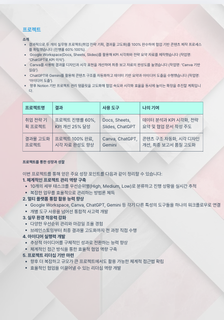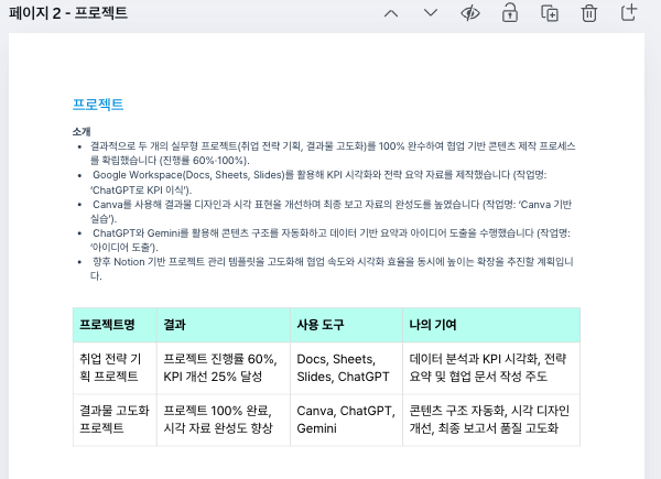 표 또는 리스트 요소로 정리한다. 도구 → 표 → 4×2를 선택해 표를 만든다.프로젝트명, 결과, 사용 도구, 나의 기여 순으로 만든다.포트폴리오 재료 페이지에 업로드)프로젝트 설명 강화 상태를 완료로 변경