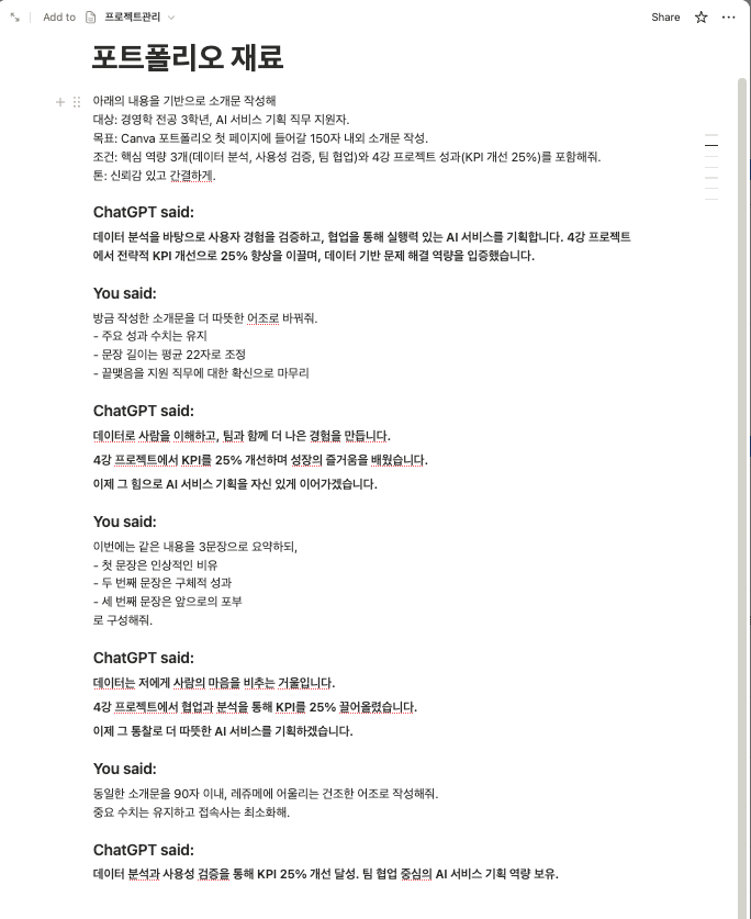목표: Canva 포트폴리오 첫 페이지에 들어갈 150자 내외 소개문 작성.